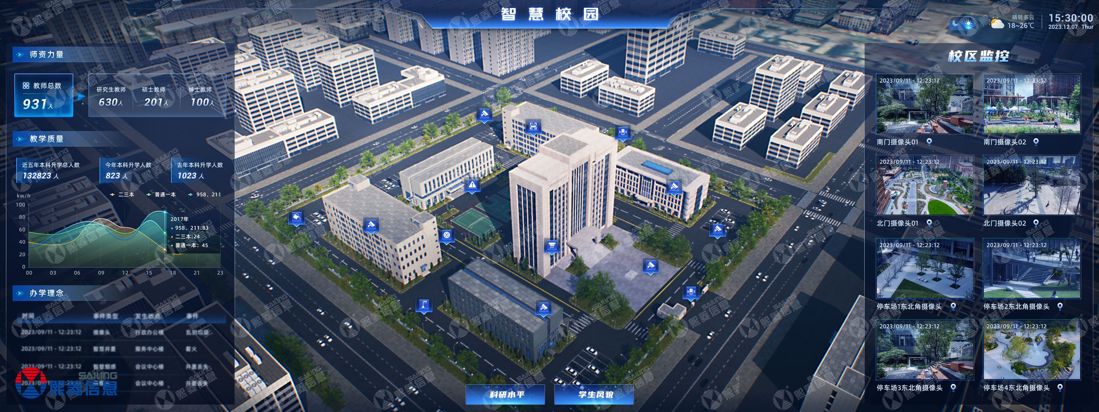 三是赋能业务。集成校区介绍、师资力量、产教融合、学生画像、安保预警、资源上图等多项场景功能,实现区域态势、决策分析、应急指挥三大方面业务应用。